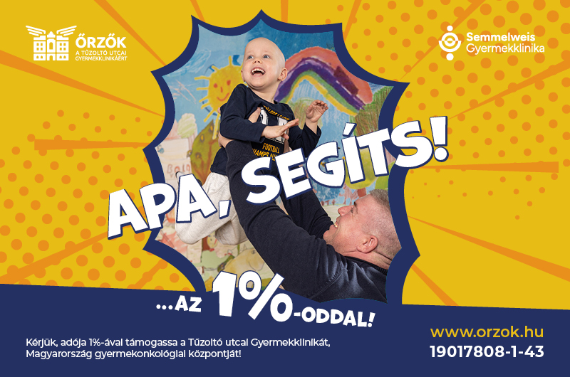 Kérjük, álljon mellénk, ha idén rendelkezni tud jövedelemadója 1%-áról. Az apák, férfi ismerősök felajánlása pótolhatja azt a támogatást, amelytől a többgyermekes anyák SZJA-mentessége miatt elesünk. Azoknak az édesanyáknak a segítsége is fontos, akik még fel tudják ajánlani az 1%-ukat. És mindenkié, aki úgy érzi, hogy a beteg gyerekek nem maradhatnak egyedül a rákkal vívott harcban Magyarország legnagyobb gyermekonkológiai központjában.