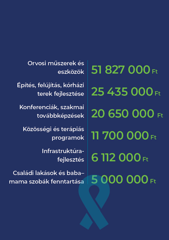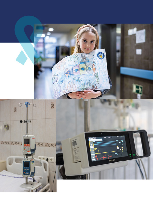 A legnagyobb volumenű támogatás az orvostechnikai eszközpark fejlesztését szolgálta, élén a gyermekgyógyászati MR-készülék beszerzésének támogatásával, amely kulcsszerepet játszik a pontos diagnózisban, a kezelések tervezésében és a gyermekek hosszú távú gyógyulási esélyeinek javításában. Ezt egészítették ki a betegőrző monitorok, infúziós pumpák, gyógytornászati és dietetikai eszközök, amelyek a mindennapi ellátás biztonságát és minőségét emelik.